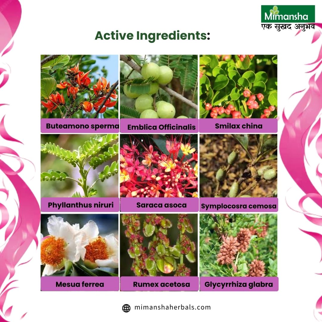 Ingredients:- Butea monosperma, saraca asoca, Emblica Officinalis Phyllanthus Nirurui, Smilax china, Symplocos racemosa, Mesua, ferrea, Rumex, acetosa and Glycyrrhiza glabra.                                       Â