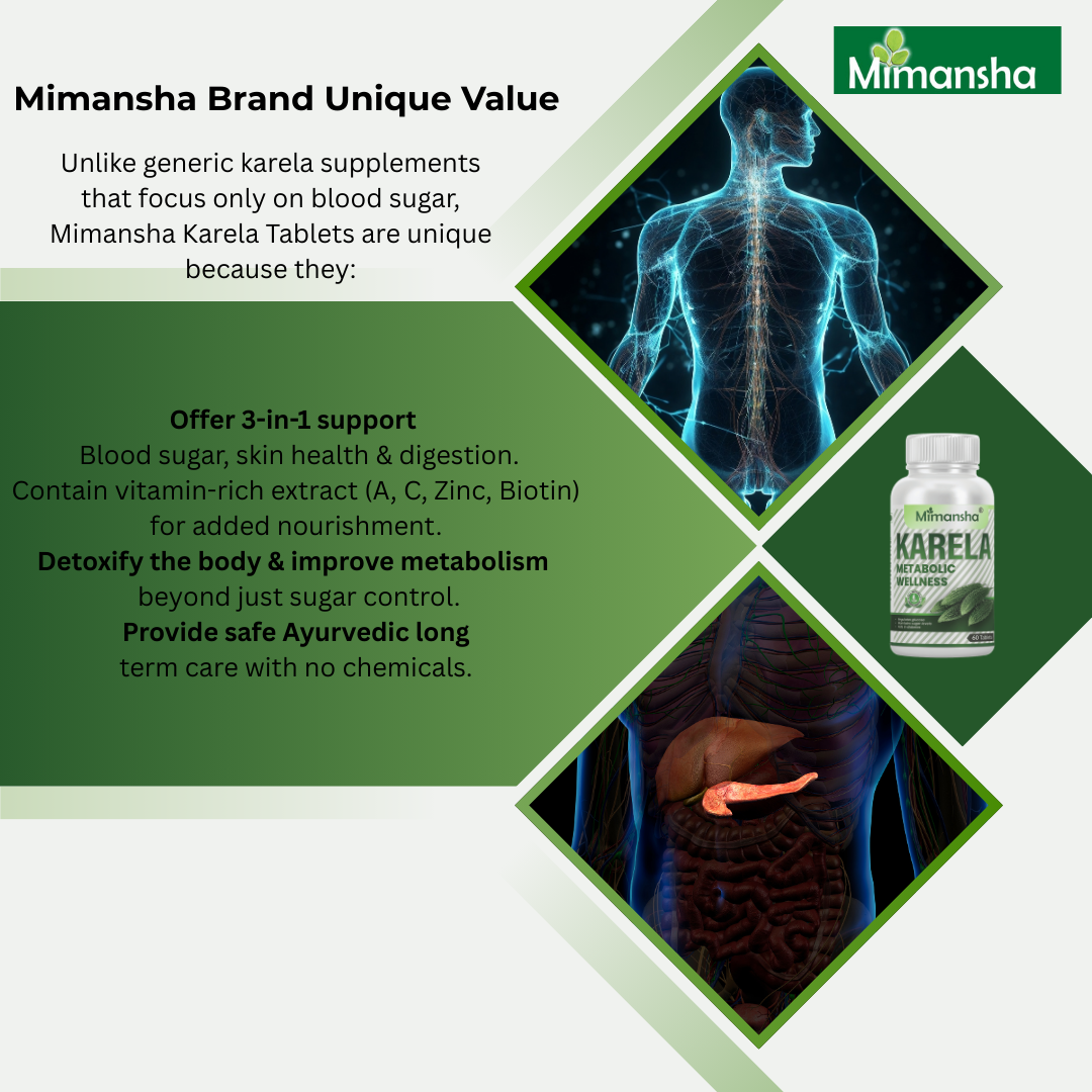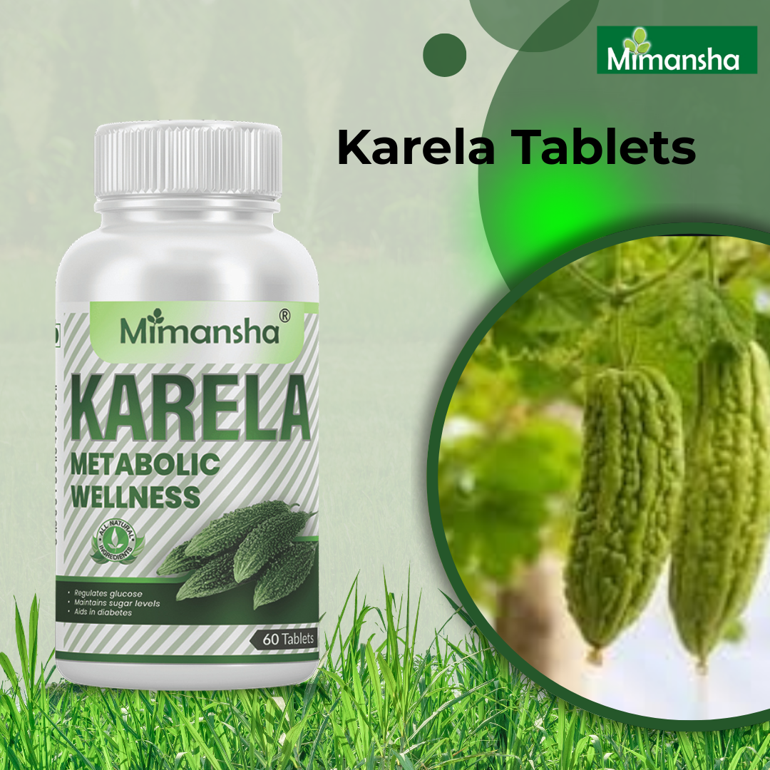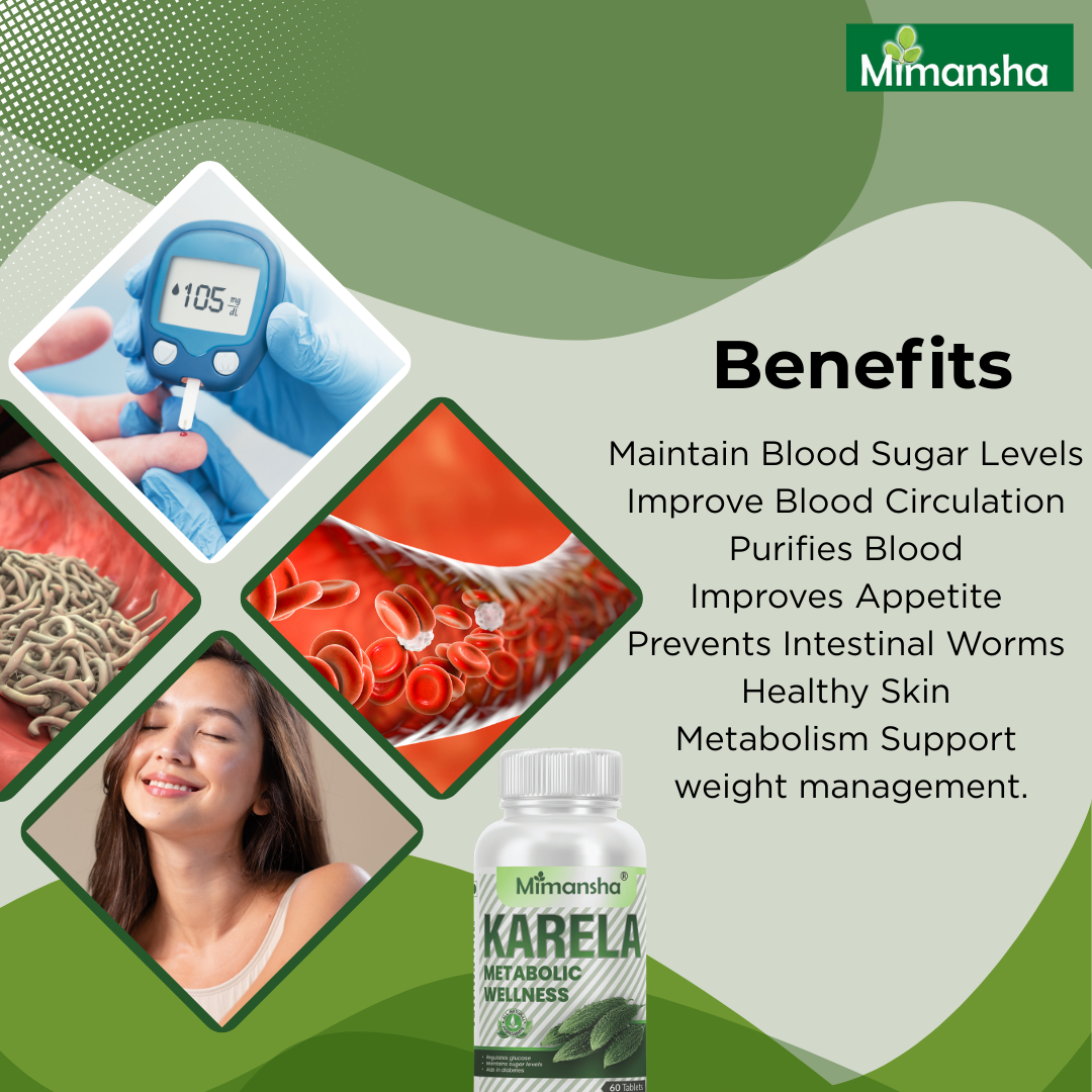 Karela, maintaining sugar levels and curing any kind of skin disorders. It contains Vitamins A & C, Zinc and Biotin which helps fight acne, blemishes, rashes. You get naturally glowing skin as it flushes out all toxins from the body effectively. To improve metabolism and control diabetes.