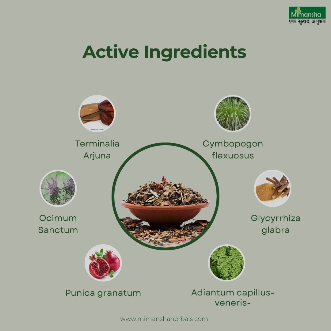 - Ingredients: Lemongrass, Pomegranate, Hansraj Fern, Licorice, Holy Basil (Tulsi), Arjuna Bark.