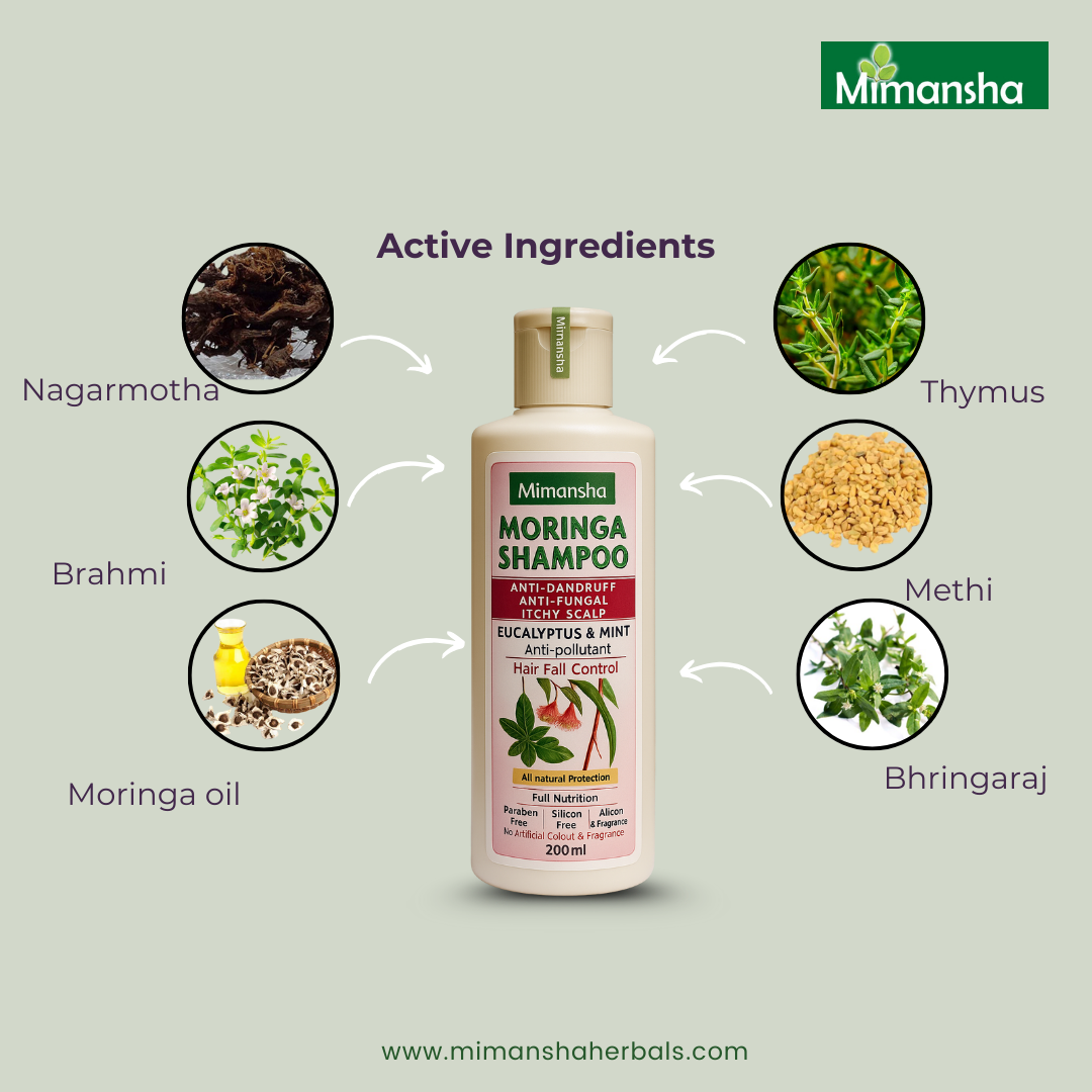 Ingredients:- Brahmi, Methi 2mg Moringa Oil, Thymus Vulgaris Brangraj, Nagarmotha peppermint, eucalyptus oil natural shampoo base.