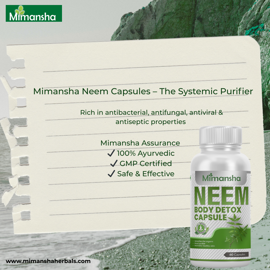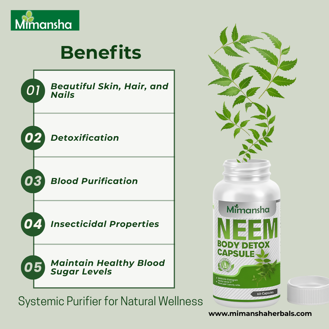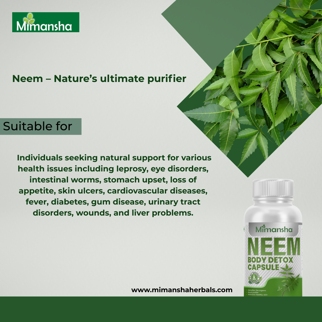 Neem is a powerful blood purifier and detoxifier and promotes healthy skin and wound healing. Apart from being a general health promoter, neem helps maintain healthy blood sugar levels. Neem is considered nature's systemic purifier, Approved supporting the natural cleansing mechanisms of our skin and internal organs.