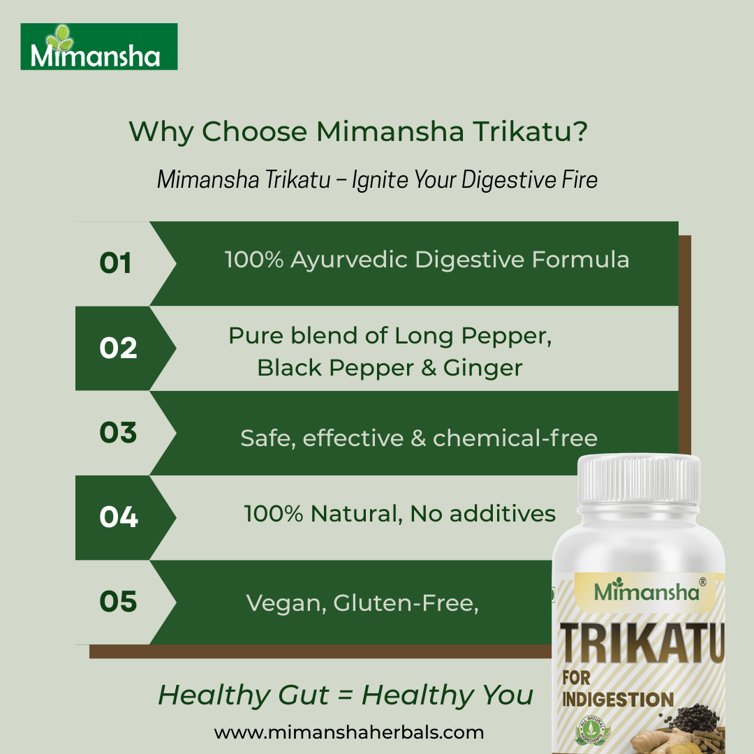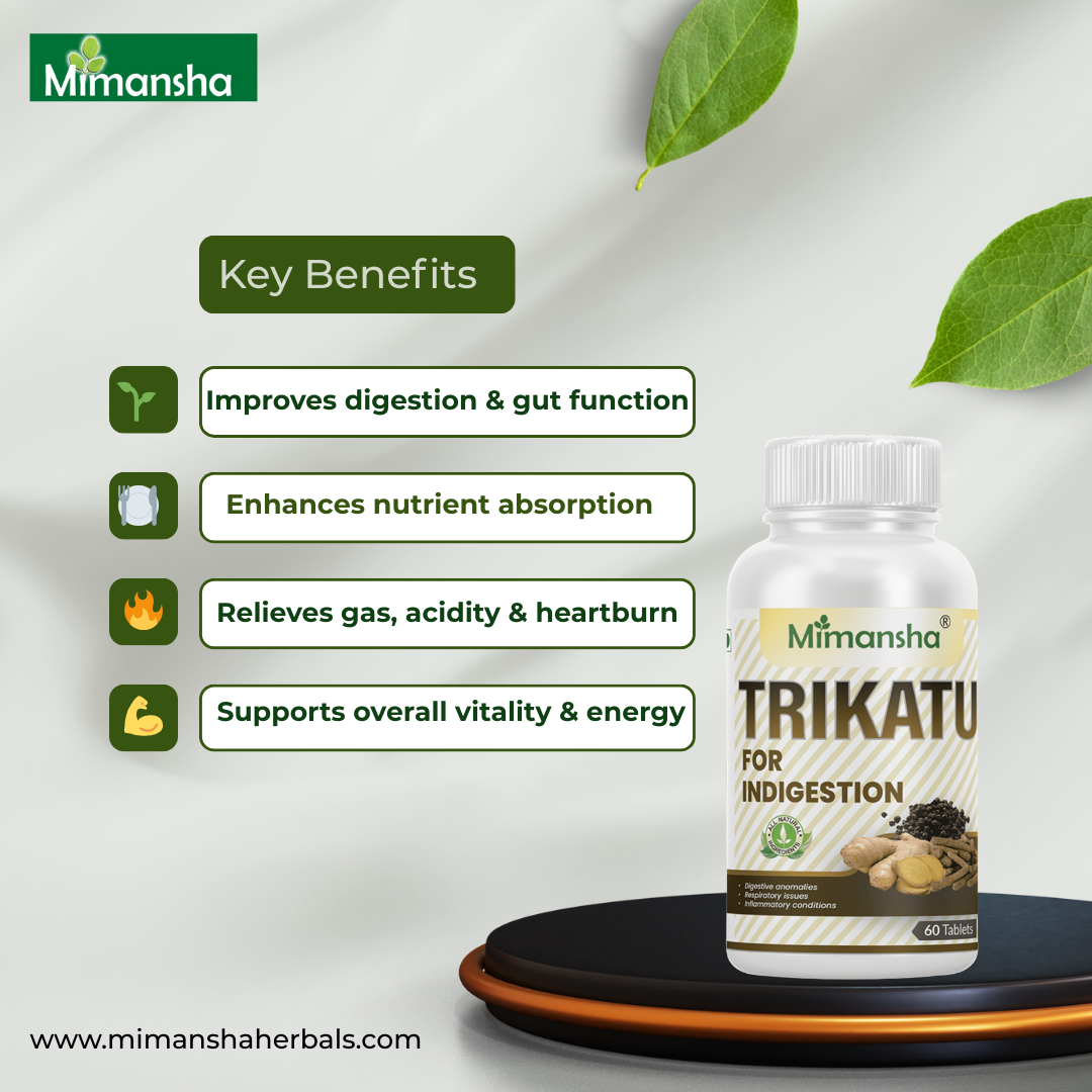 Trikatu, made from Long Pepper, Black Pepper, Ginger, is traditionally used to support digestion and the overall gastric function, Including better absorption of nutrients.