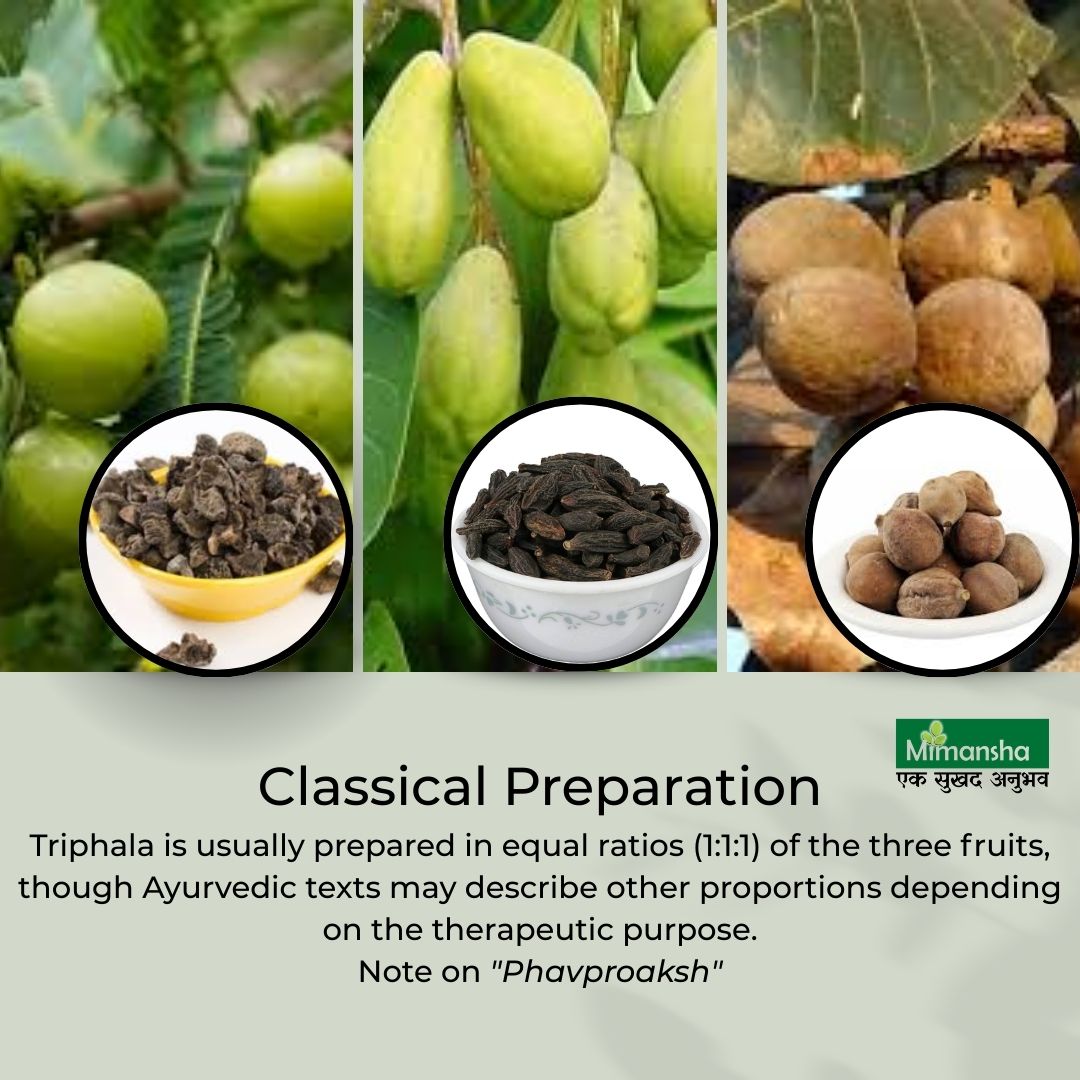 Ingredients:- Emblica officinalis (Amalaki), Terminalia bellerica (Bibhitaki), and Terminalia chebula (Haritaki)