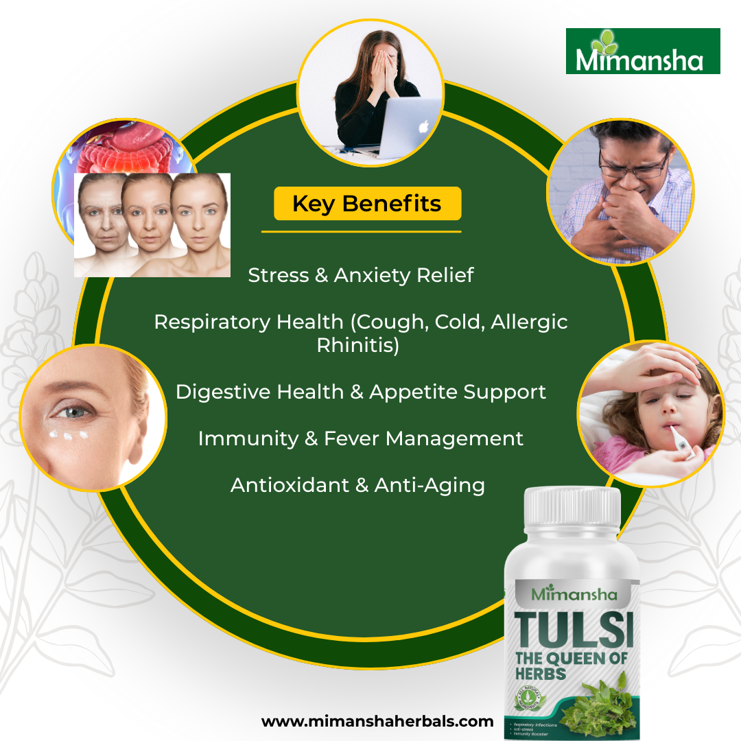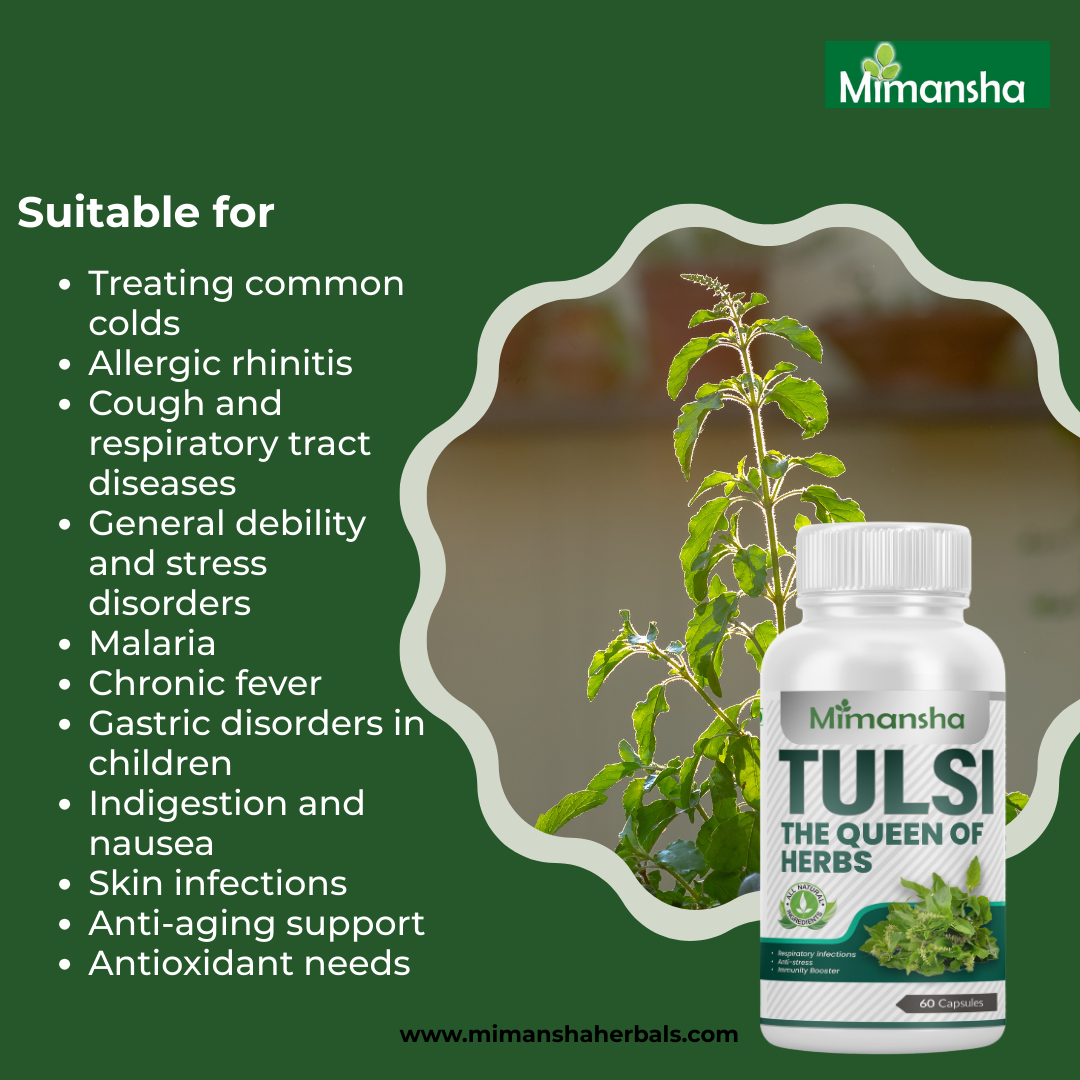 Tulsi is an herb often used in Ayurvedic or alternative medicine. It may help relieve stress and anxiety, improve mood and mental function, and help treat certain chronic conditions. Some research also shows that it could lower cholesterol and blood sugar levels. The Tulsi capsule is useful in common cold and coughs, general debility and stress disorders, malaria, chronic fever, gastrica disorders of children, catarrh, indigestion and nausea, skin infections, anti-aging etc.Â